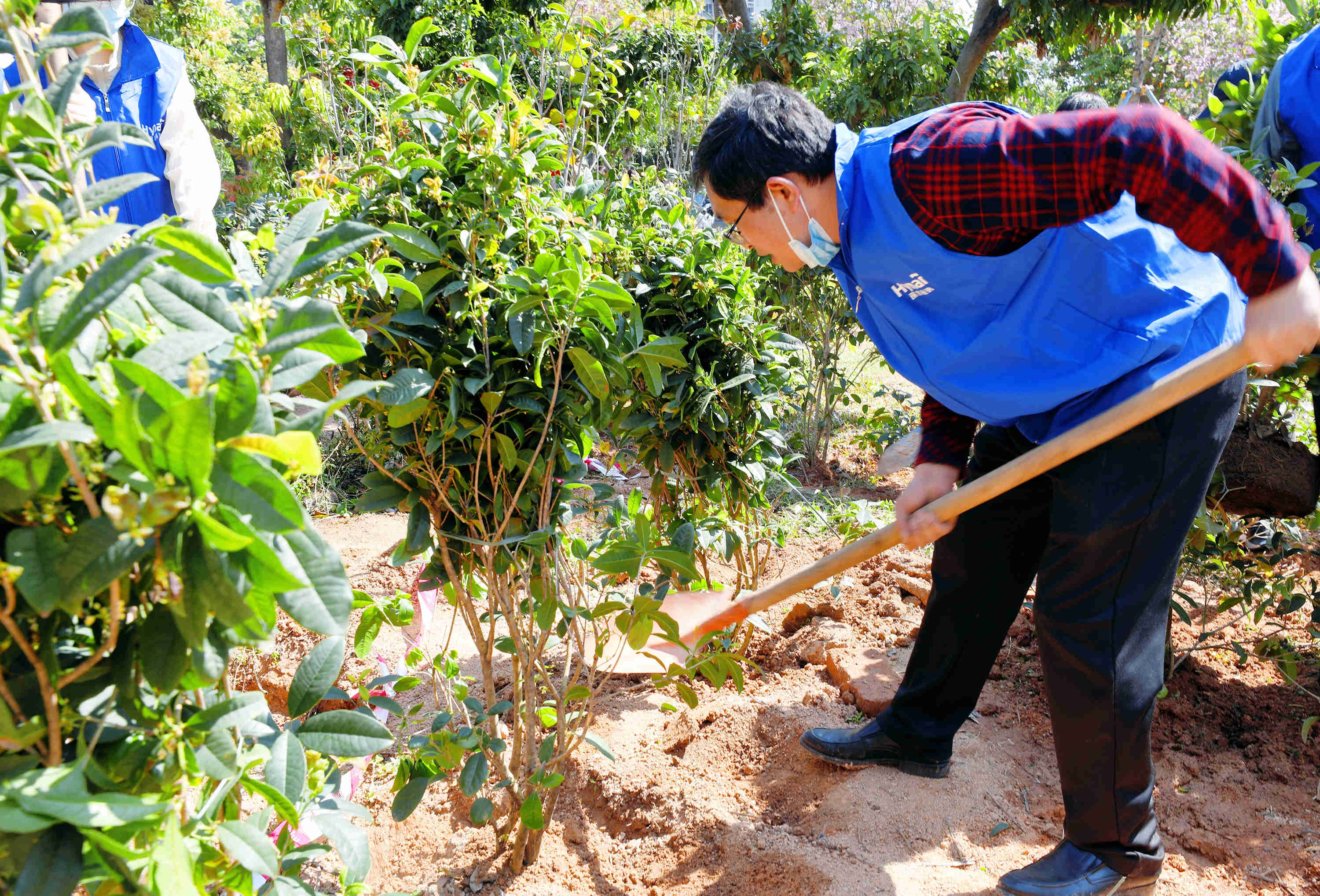 合力扶苗、铲土、施肥、浇水