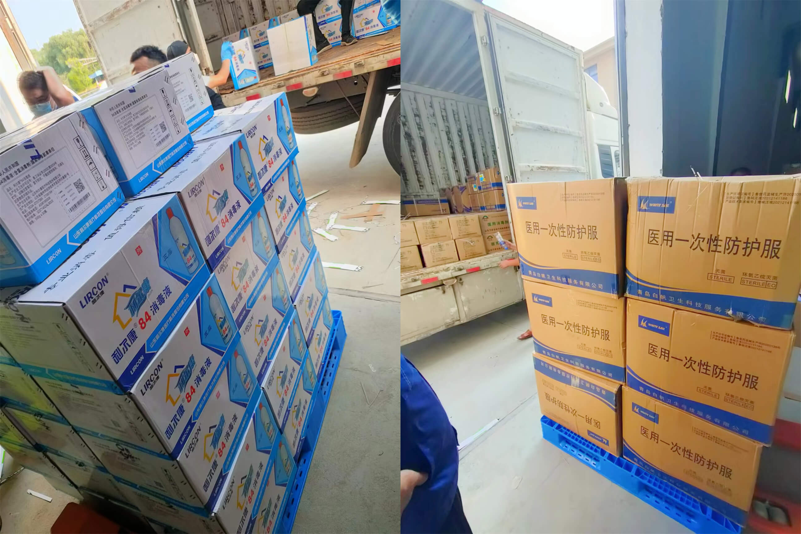 山东深水总经理朱玉海带领员工,和曹县救灾物资储备库工作人员共同卸车、搬运,以最快的速度将防疫物资第一时间交付到位。
