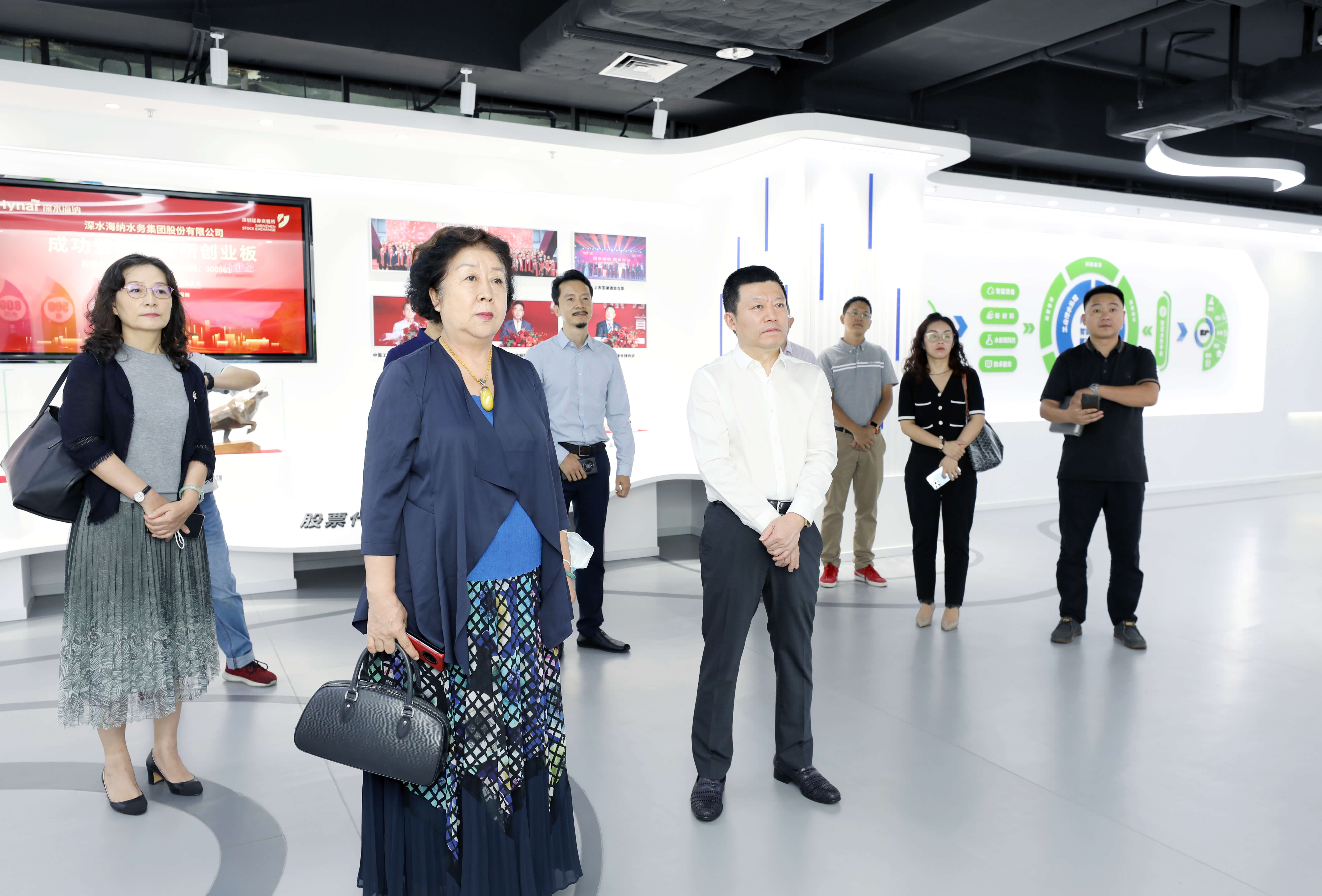 座谈会前,于剑书记一行参观了深水海纳集团的品牌展厅,深入了解深水海纳的发展历程、主营业务、技术优势和典型案例,并重点考察了深水海纳自主研发的“Hy-Smart”智慧水务运营系统在工业污水处理和优质供水领域的应用情况。