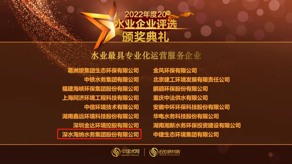 3月23日,由E20环境平台主办的“2023(第二十一届)水业战略论坛”在北京开幕,论坛隆重揭晓了2022年度(第二十届)水业企业评选细分领域获奖企业名单。深水海纳水务集团股份有限公司凭借卓越的运营水平和优秀的服务品质,荣获“2022年度水业最具专业化运营服务”奖项。