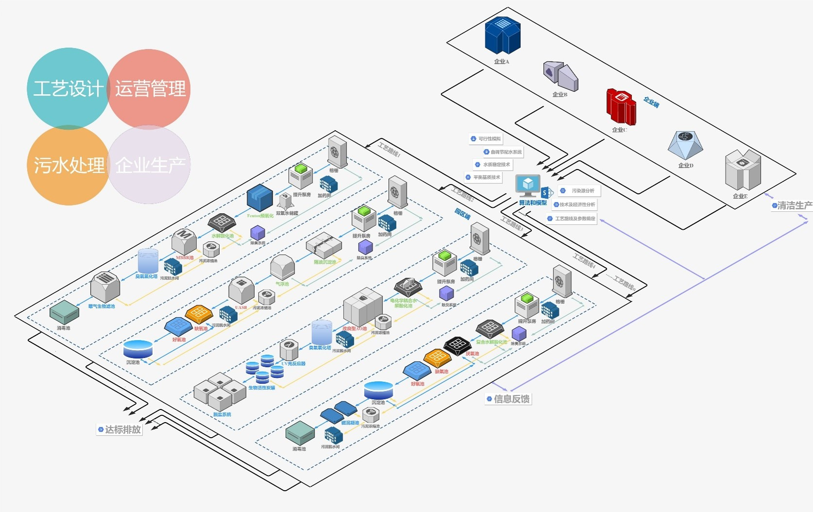 TEPS模式是当今工业园区污水治理的最佳实践,以总程平衡为主要技术手段,建立从规划、设计、建造、运营全生命周期的WIM和EIM模型,通过高效水务管理机制实现水资源循环利用与上下游污水处理联动,通过水质、量在企业端与园区端时空二维均衡实现企业端适度预处理和园区端强化集中处理最佳技术组合和最优经济效益。