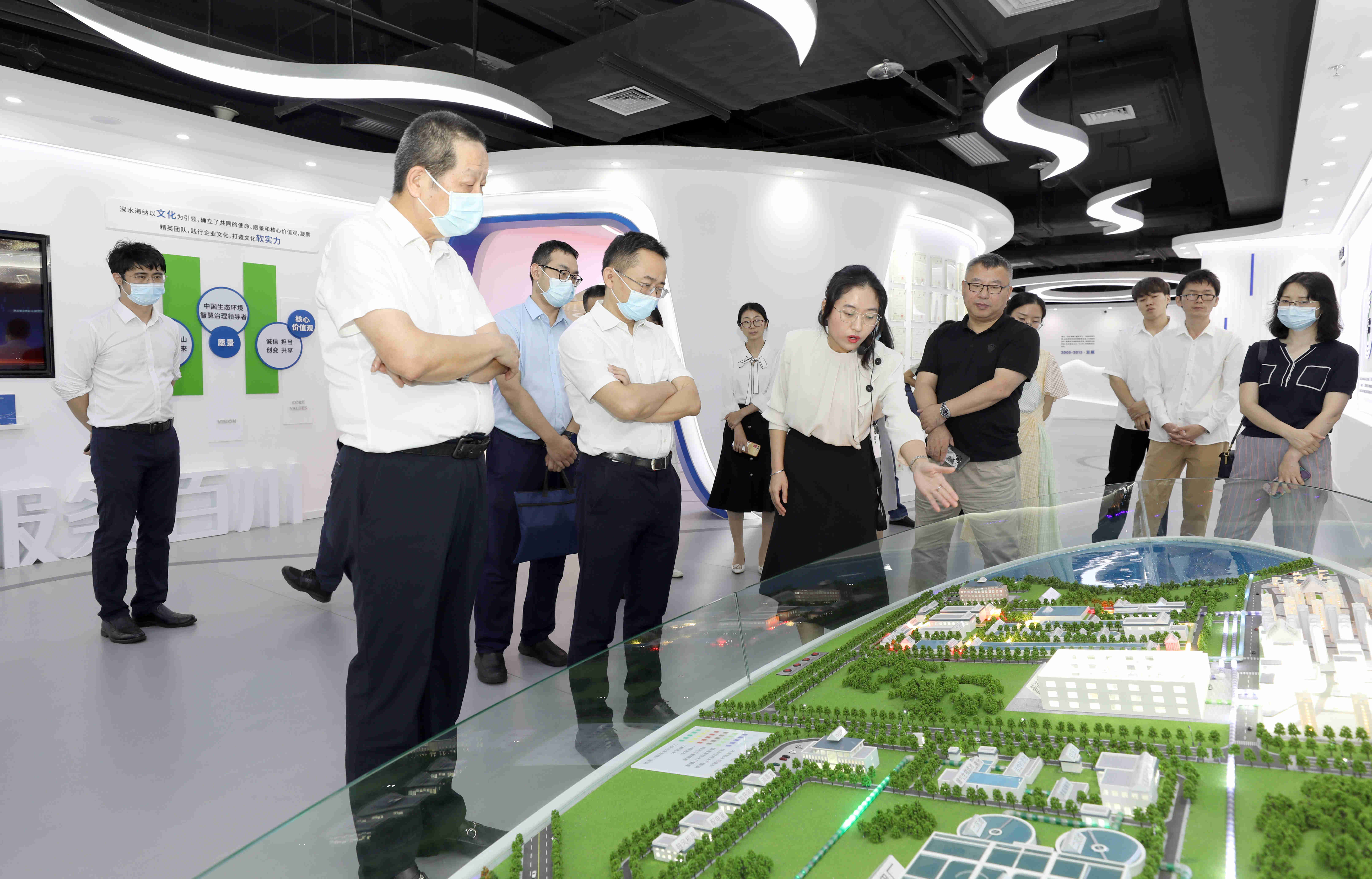 在深水海纳集团总裁肖吉成的陪同下,深圳市科技创新委员会及东莞市科技局领导参观了深水海纳的展厅,认真听取了深水海纳总裁办公室主任金香梅关于公司的发展历程、主营业务、技术优势和典型案例等情况的详细汇报。