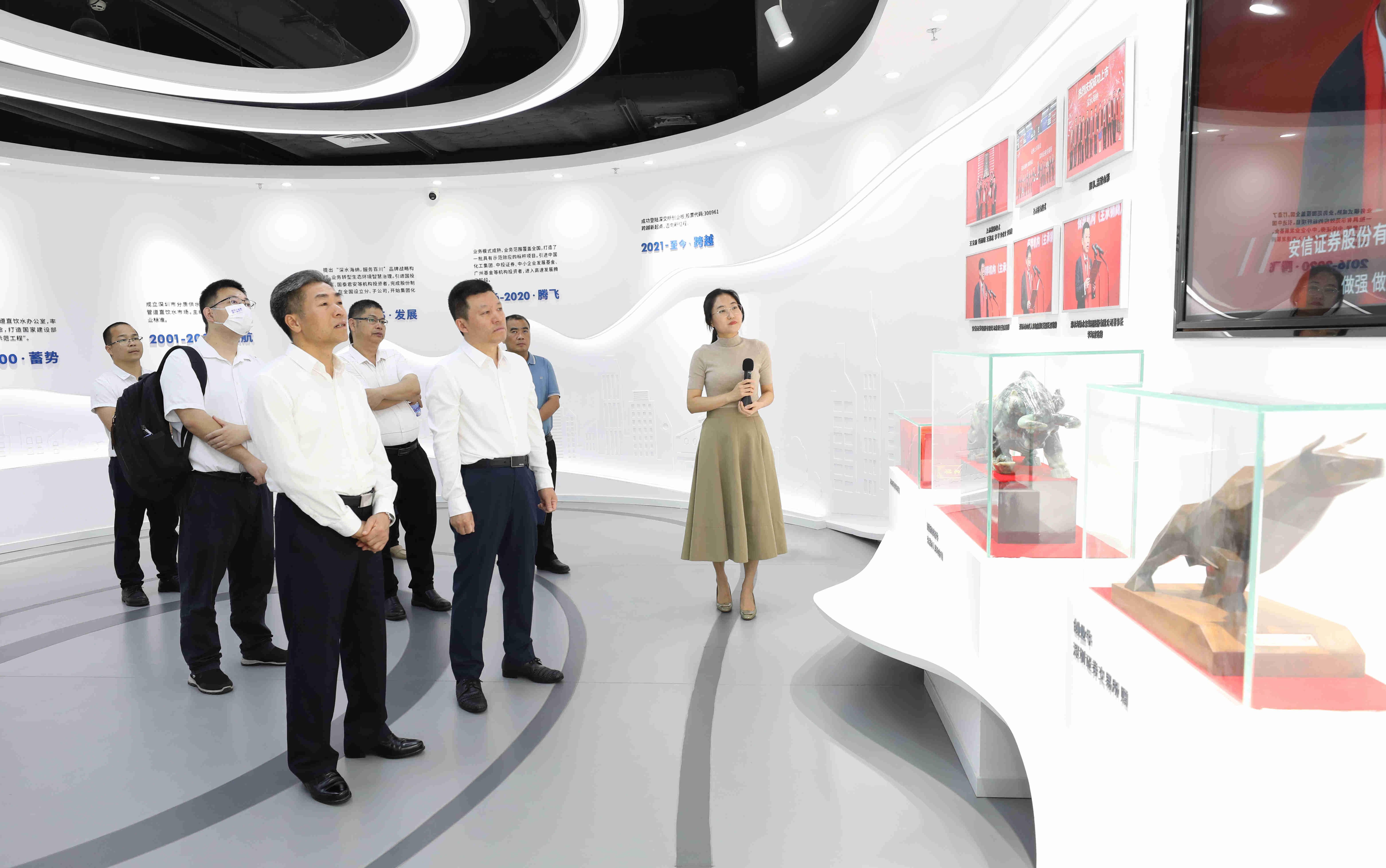 在李海波的陪同下,调研组一行参观了深水海纳集团的品牌展厅,认真听取了深水海纳集团总裁办公室主任金香梅关于公司的发展历程、主营业务、技术优势和典型案例等方面的详细汇报。
